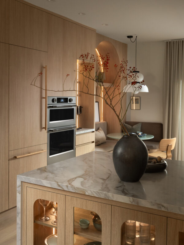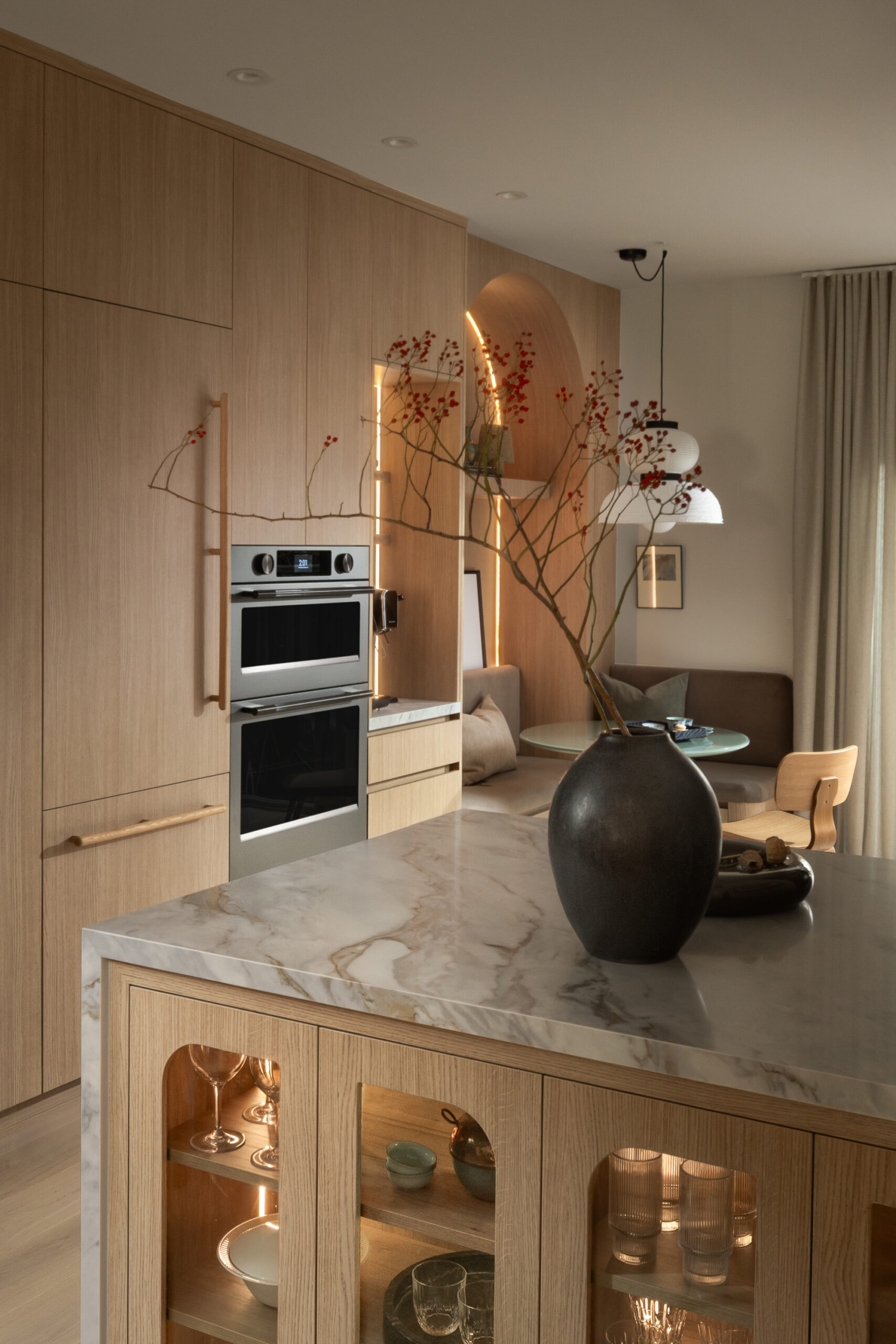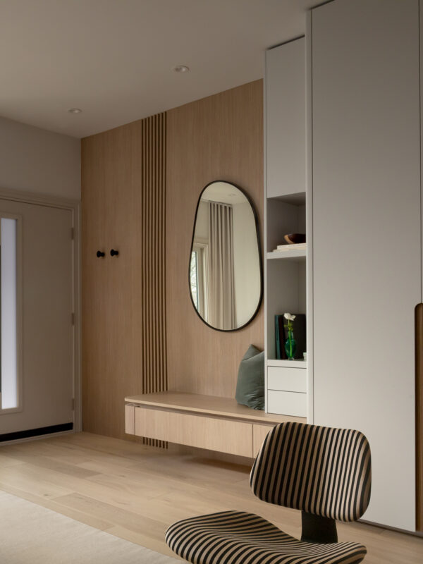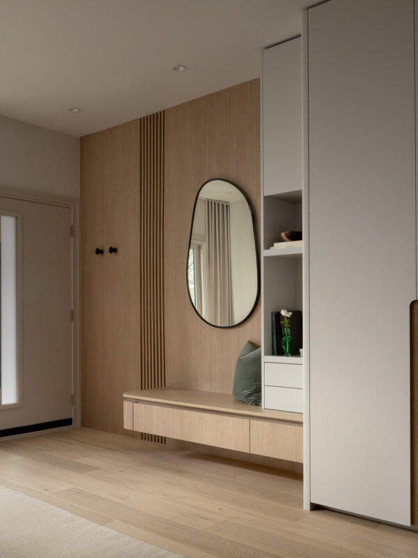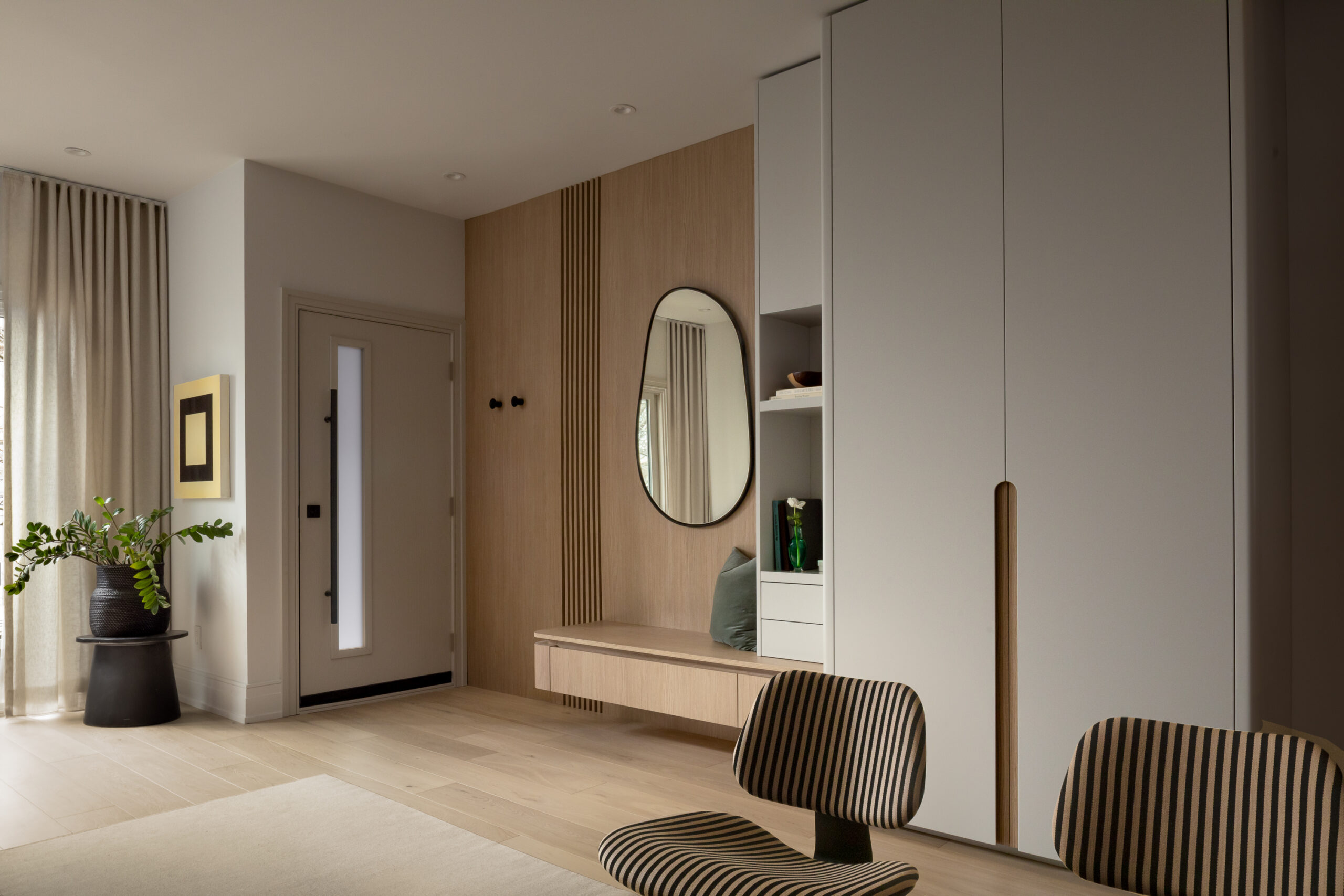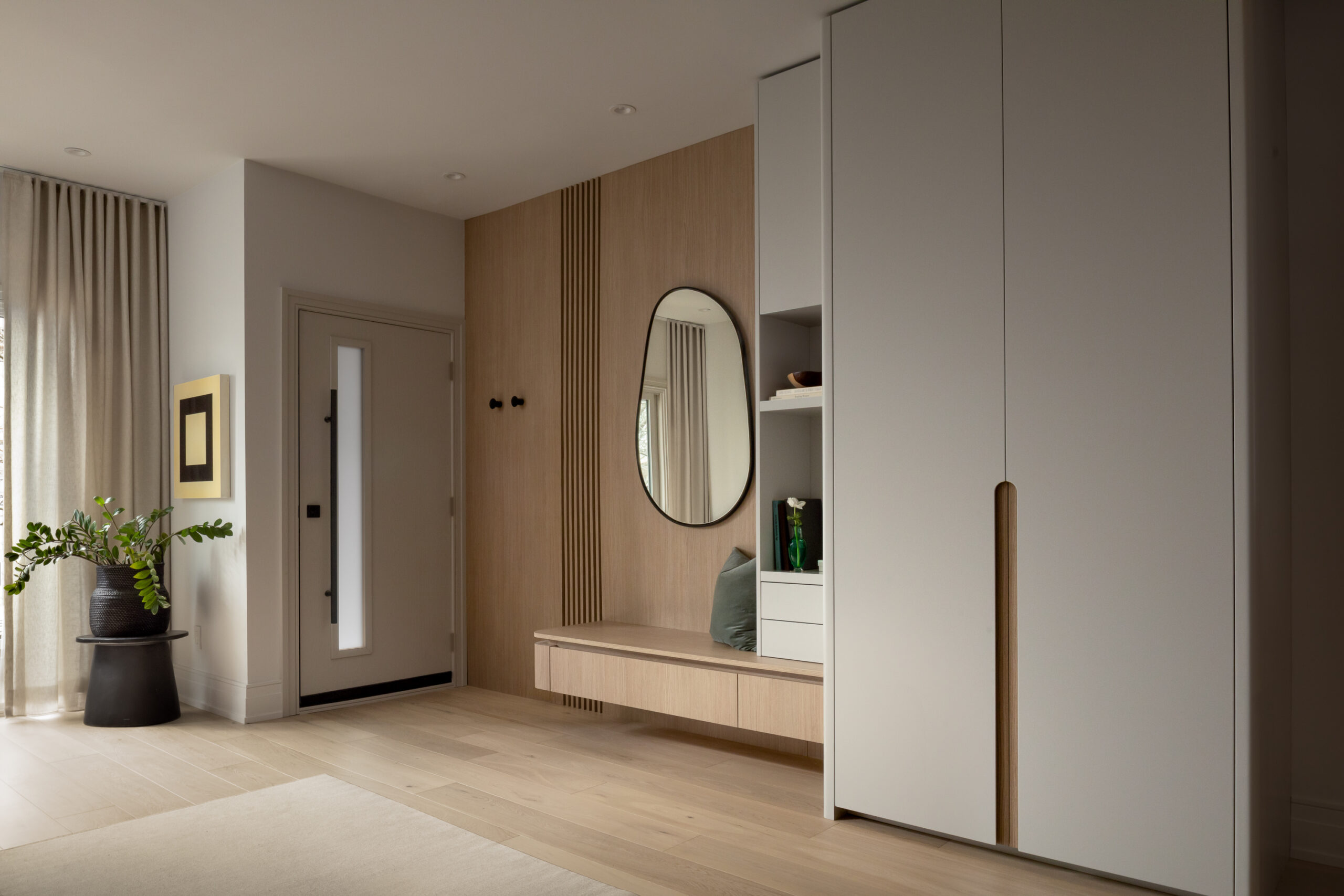 This project transformed a dated main floor into a calm, highly functional living space focused on quality materials and thoughtful design. The entry was reimagined with custom millwork, integrated storage, a floating bench, and rift-cut oak slats to create a warm and welcoming first impression. The kitchen was fully reconfigured to improve flow and connection to the dining area, featuring a new peninsula, custom banquette seating, integrated appliances, durable stone surfaces, and layered lighting for everyday comfort. Custom millwork conceals appliances and incorporates a coffee station and illuminated display cabinet, resulting in a modern, balanced home that feels refined, inviting, and easy to live in.