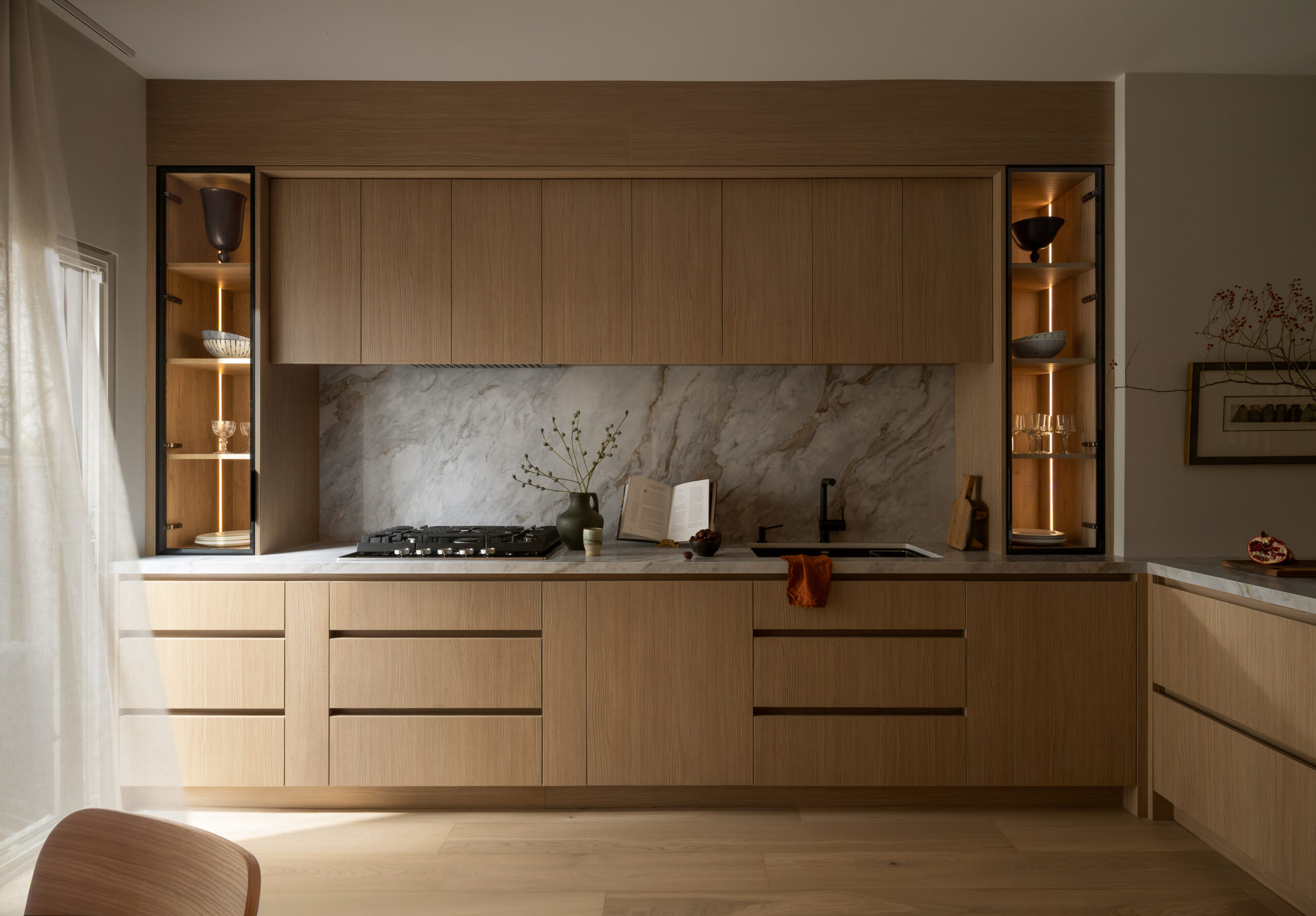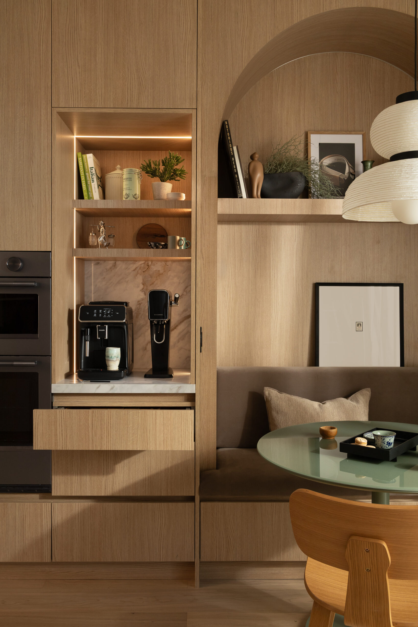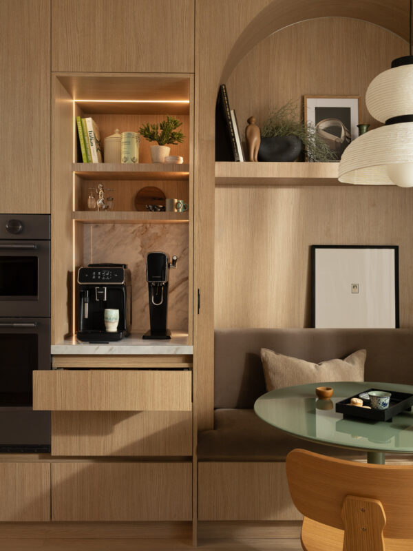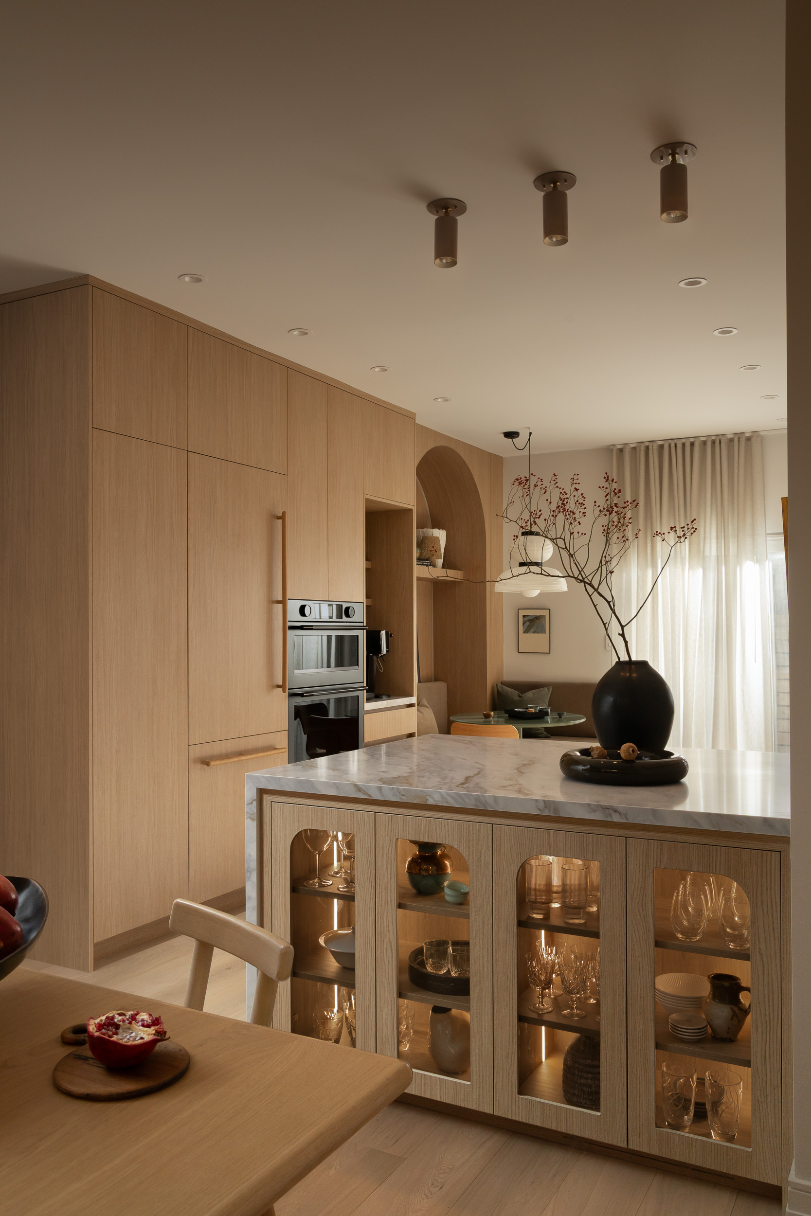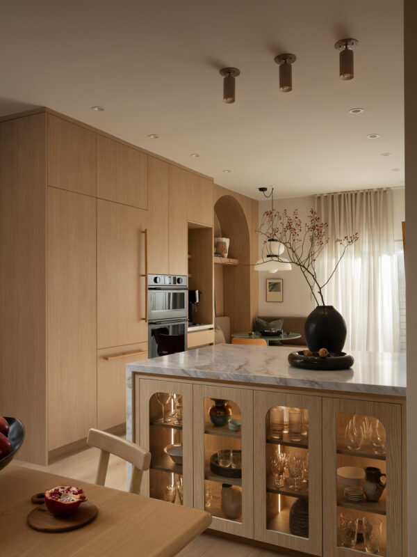 This project transformed a dated main floor into a calm, highly functional living space focused on quality materials and thoughtful design. The entry was reimagined with custom millwork, integrated storage, a floating bench, and rift-cut oak slats to create a warm and welcoming first impression. The kitchen was fully reconfigured to improve flow and connection to the dining area, featuring a new peninsula, custom banquette seating, integrated appliances, durable stone surfaces, and layered lighting for everyday comfort. Custom millwork conceals appliances and incorporates a coffee station and illuminated display cabinet, resulting in a modern, balanced home that feels refined, inviting, and easy to live in.