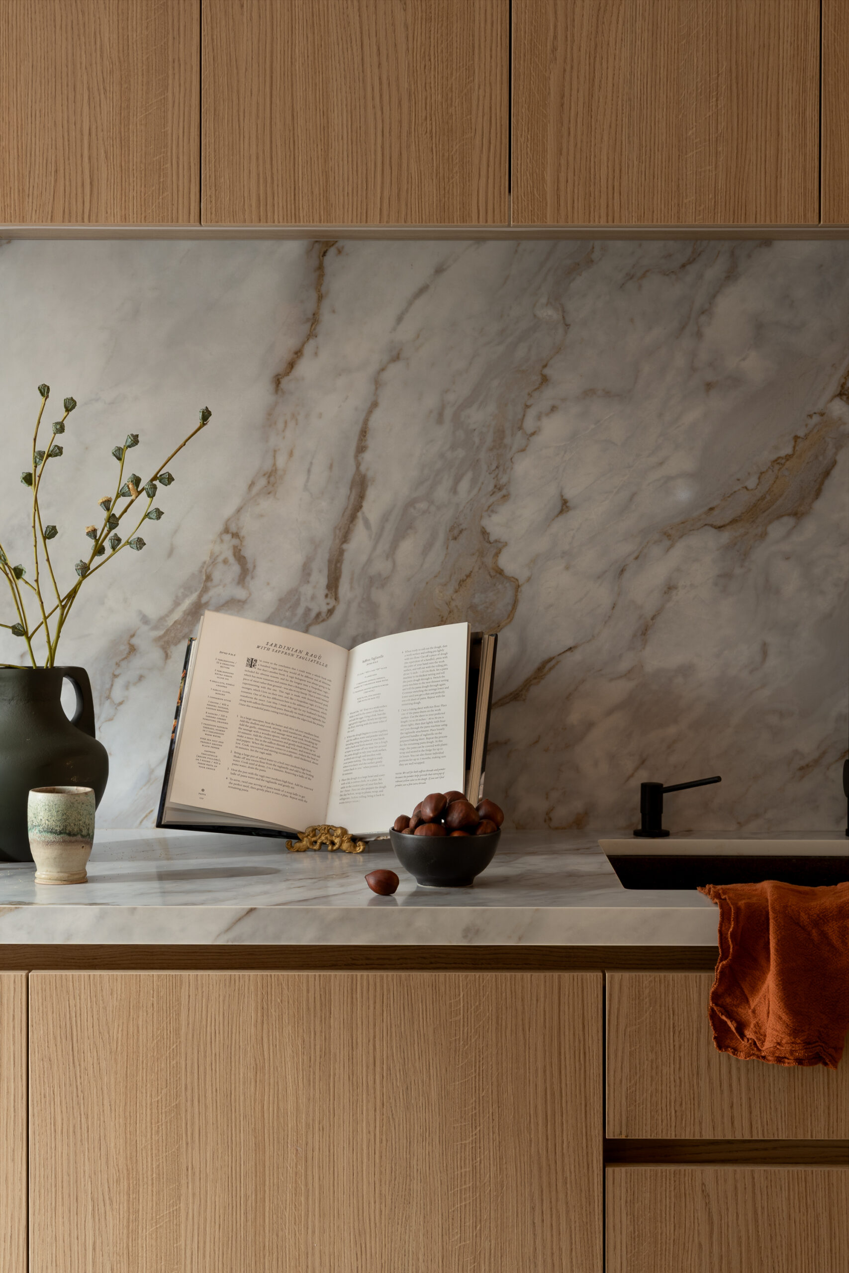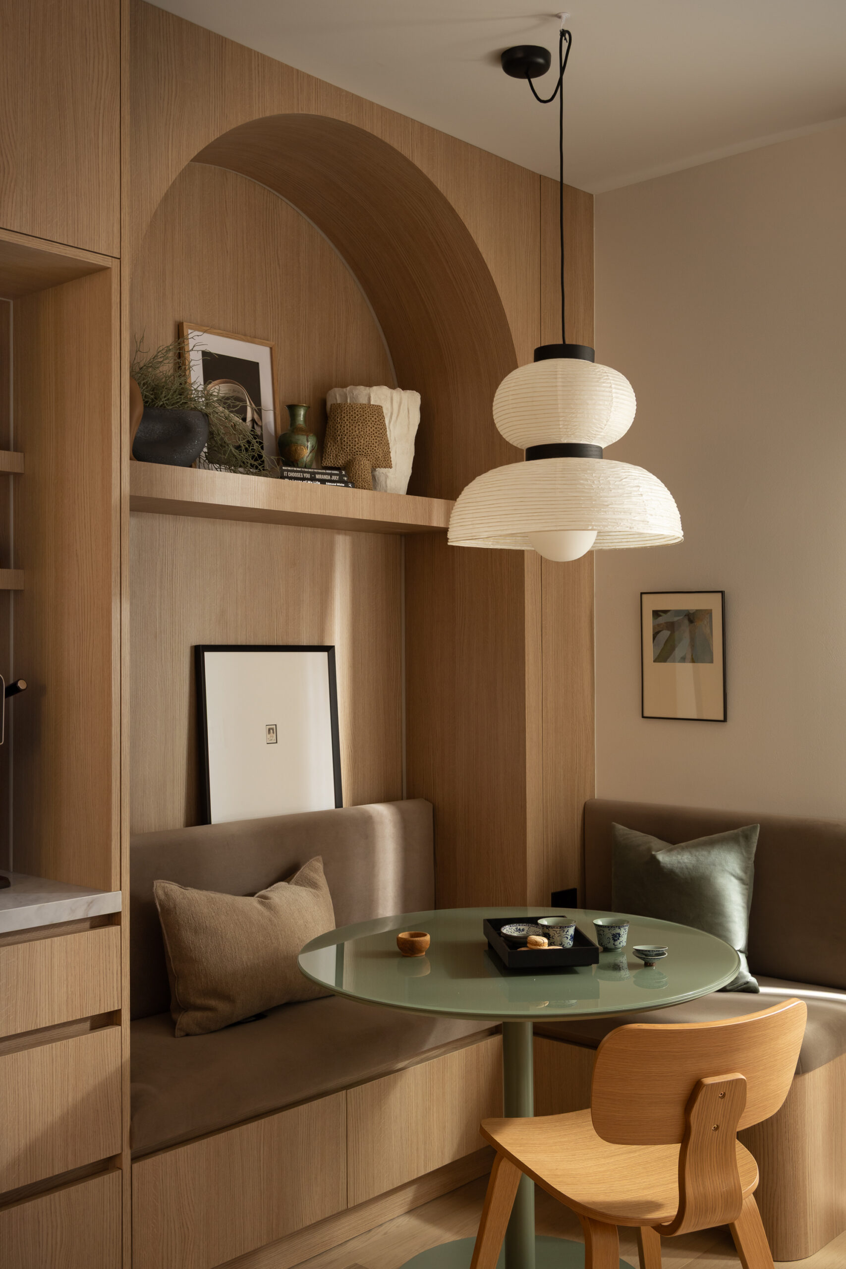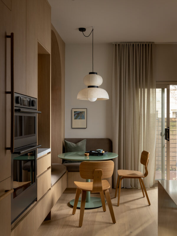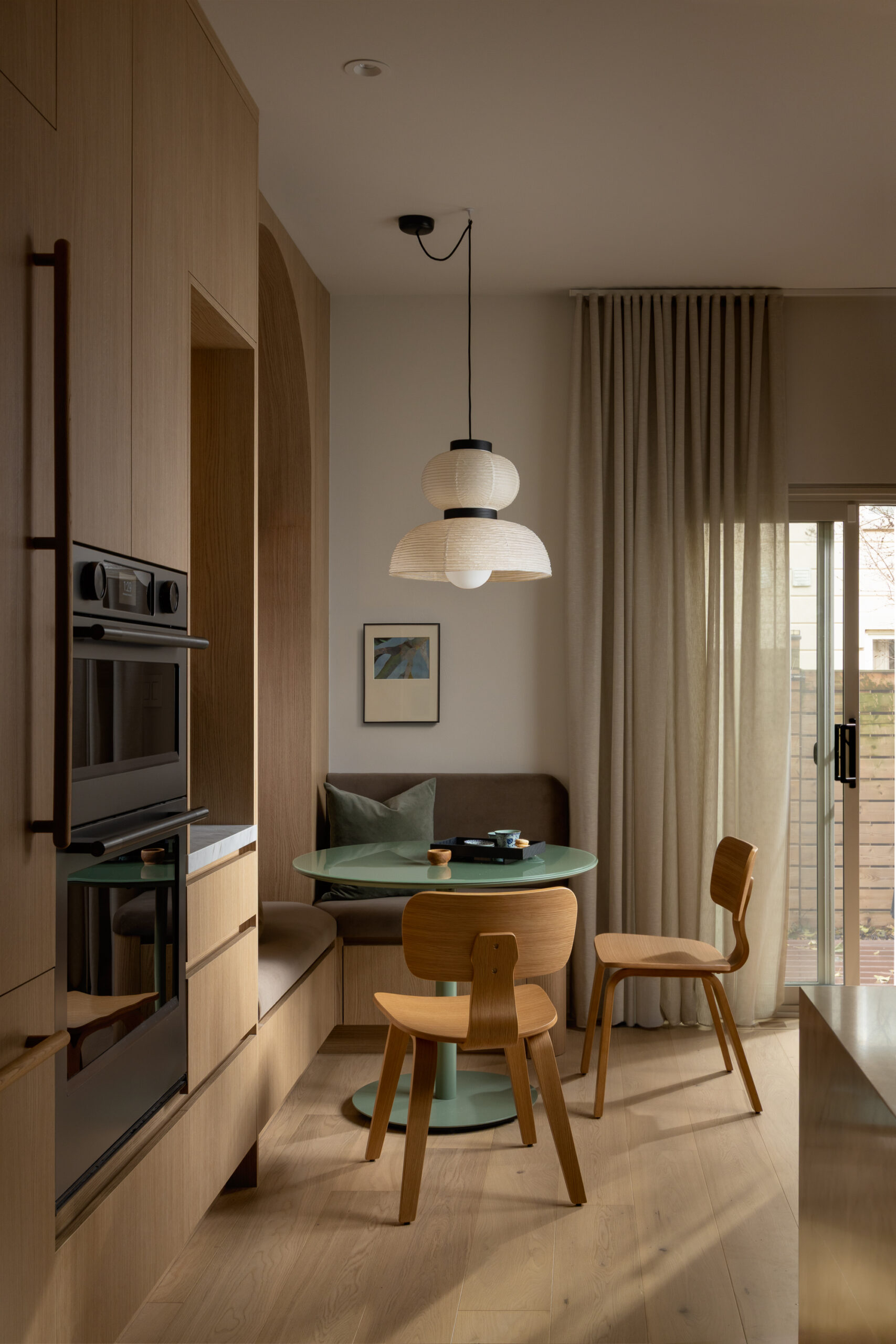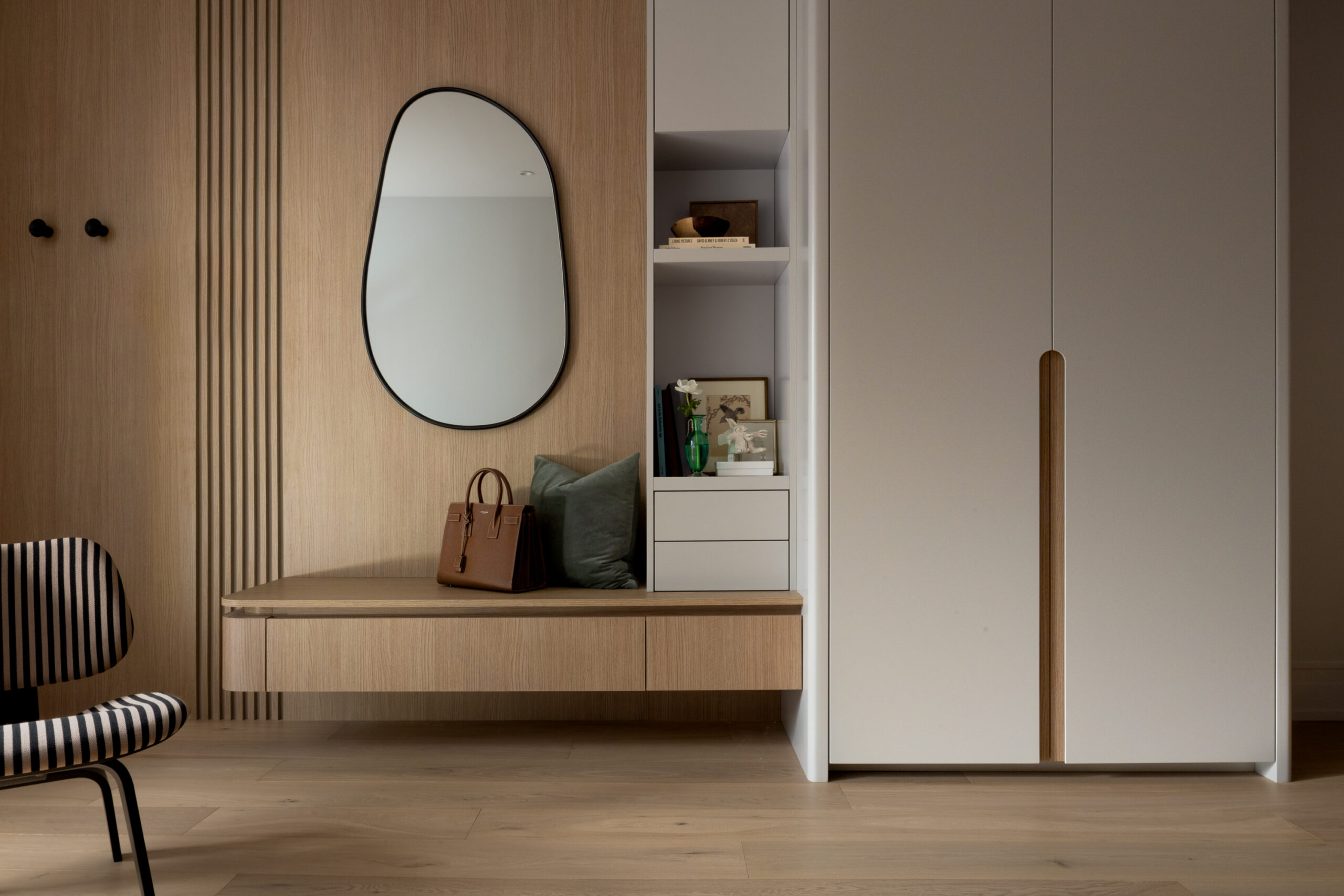 This project transformed a dated main floor into a calm, highly functional living space focused on quality materials and thoughtful design. The entry was reimagined with custom millwork, integrated storage, a floating bench, and rift-cut oak slats to create a warm and welcoming first impression. The kitchen was fully reconfigured to improve flow and connection to the dining area, featuring a new peninsula, custom banquette seating, integrated appliances, durable stone surfaces, and layered lighting for everyday comfort. Custom millwork conceals appliances and incorporates a coffee station and illuminated display cabinet, resulting in a modern, balanced home that feels refined, inviting, and easy to live in.
